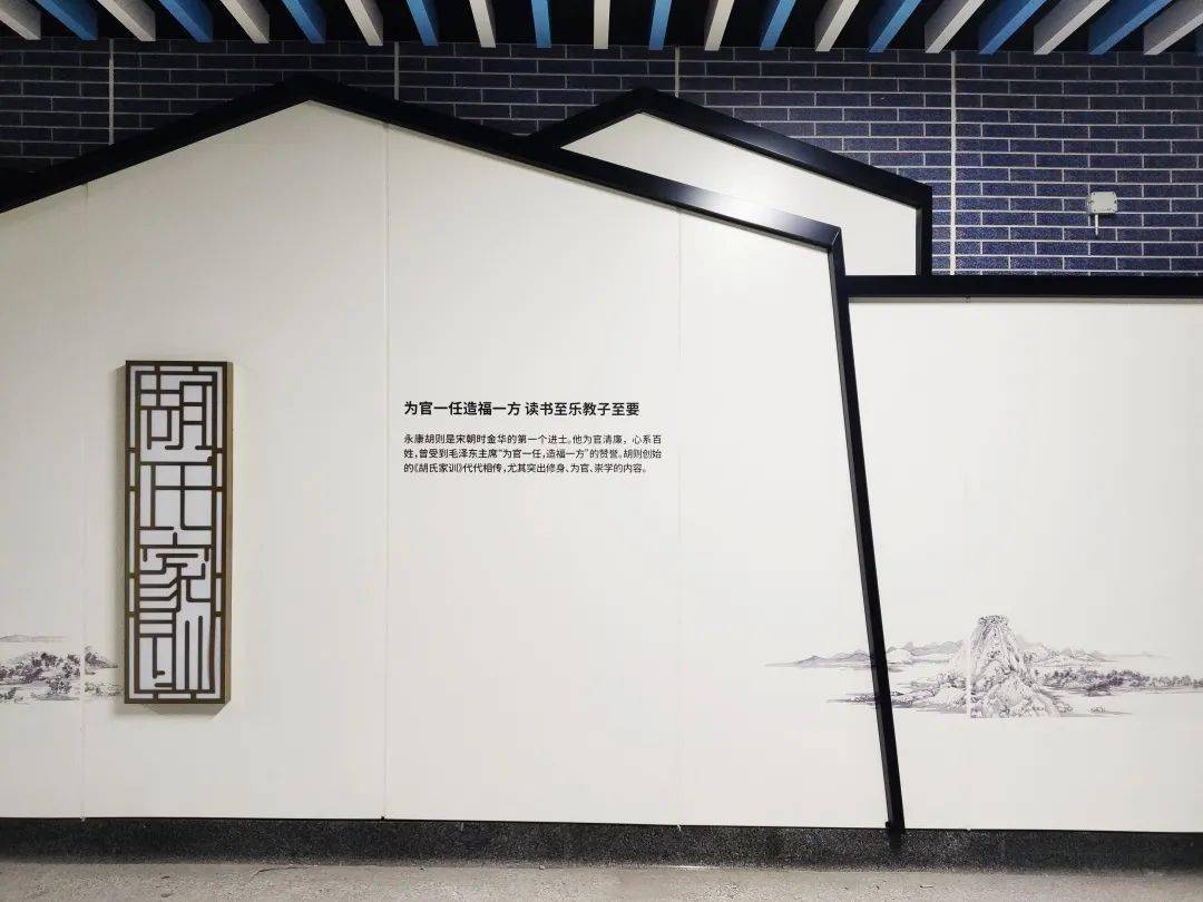 用江南水鄉(xiāng)的黑瓦白墻做底,嵌入金華各縣市的優(yōu)秀家風(fēng)家訓(xùn),表達(dá)“禮義廉恥孝悌忠信”。同時(shí),還設(shè)置了幾枚銅鏡,方便來(lái)往的行人稍停腳步整理衣冠。